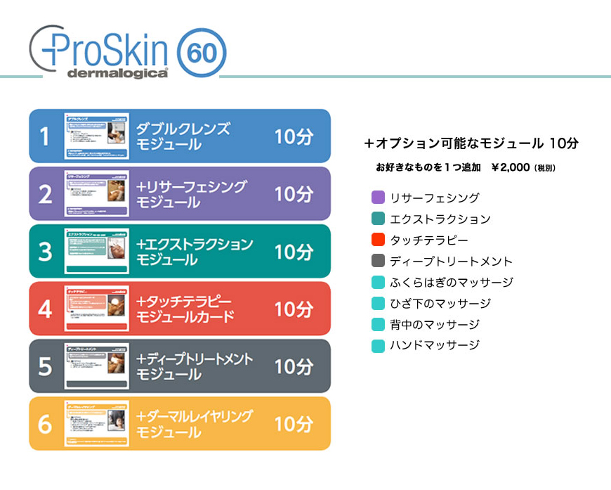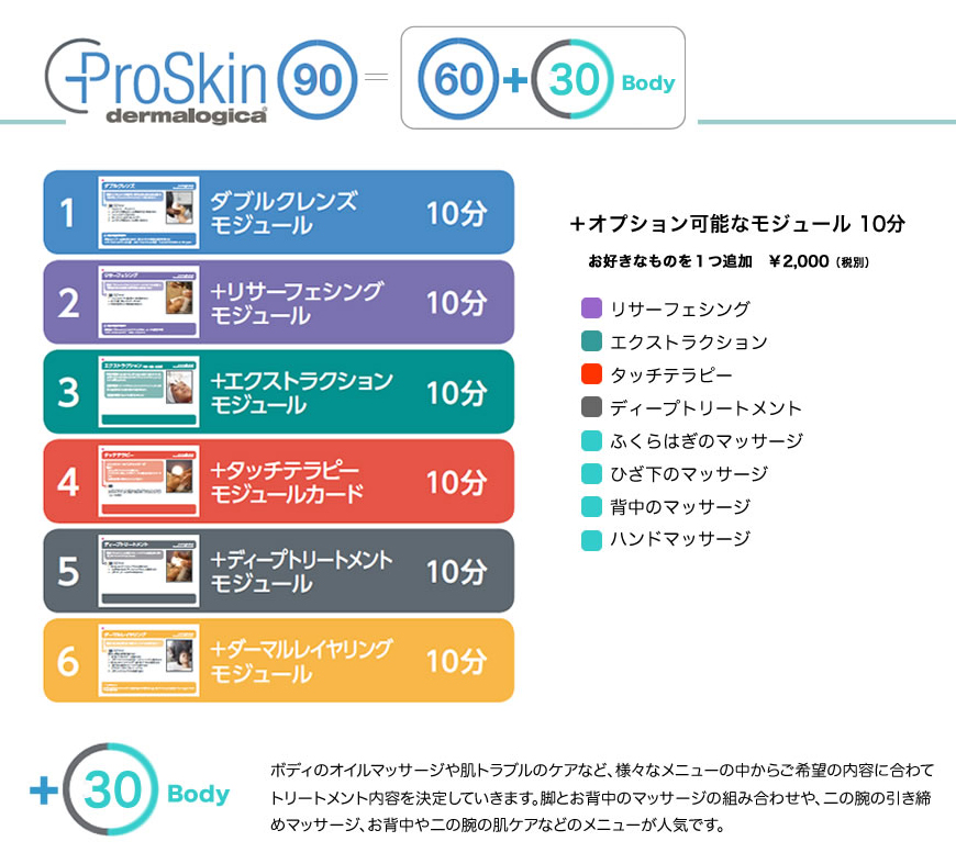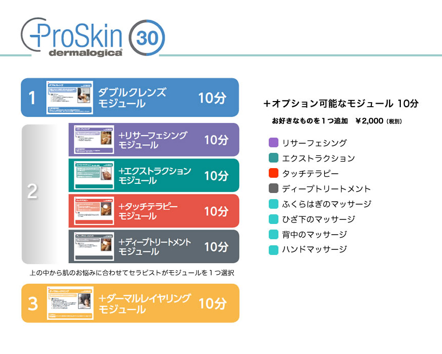 | プロスキン30 5,000円(税別) 施術時間30分 所要時間60分 | プロスキン60 10,000円(税別) 施術時間60分 所要時間90分 | プロスキン90 15,000円(税別) 施術時間90分 所要時間120分 | |